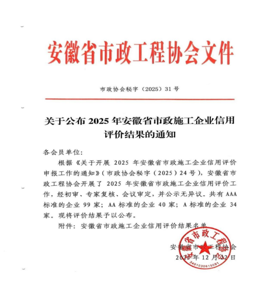 近日,安徽省市政工程協(xié)會(huì)正式發(fā)布《關(guān)于公布2025年安徽省市政施工企業(yè)信用評(píng)價(jià)結(jié)果的通知》。黃山市建工集團(tuán)憑借卓越的綜合實(shí)力、規(guī)范的市場(chǎng)行為、優(yōu)良的工程品質(zhì)及堅(jiān)實(shí)的信用體系建設(shè),成功獲評(píng)最高信用等級(jí)——AAA級(jí)。標(biāo)志著集團(tuán)在誠信經(jīng)營、履約能力與社會(huì)責(zé)任履行方面獲得了行業(yè)主管部門與協(xié)會(huì)的高度認(rèn)可,是企業(yè)信用建設(shè)領(lǐng)域的又一重要里程碑。
