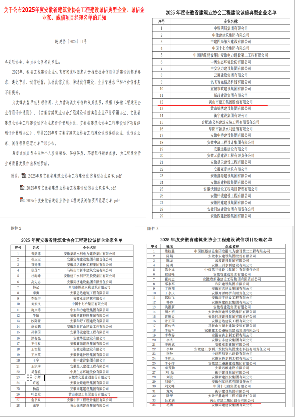 在安徽省建筑業(yè)協(xié)會(huì)同期開展的2025年度評(píng)選中,黃山市建工集團(tuán)股份有限公司被授予 “2025年度安徽省工程建設(shè)誠信典型企業(yè)” 榮譽(yù)稱號(hào)。這是對(duì)我公司長期以來遵守市場秩序、嚴(yán)格合同履約、積極承擔(dān)社會(huì)責(zé)任等方面表現(xiàn)的褒獎(jiǎng)。
