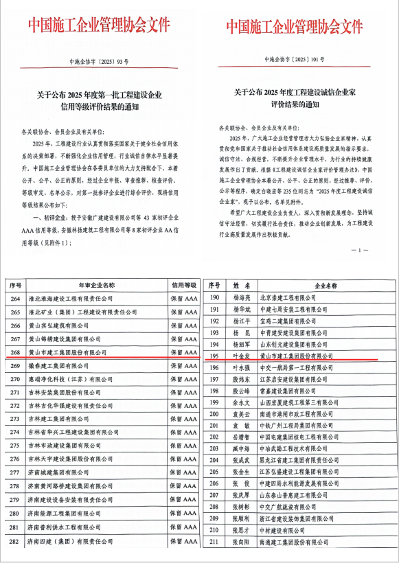 近日,國家及省級(jí)行業(yè)協(xié)會(huì)相繼公布關(guān)于2025年度工程建設(shè)領(lǐng)域系列信用評(píng)價(jià)與先進(jìn)評(píng)選的結(jié)果,黃山市建工集團(tuán)股份有限公司憑借卓越的綜合實(shí)力、良好的市場信譽(yù)和穩(wěn)健的經(jīng)營表現(xiàn),在多個(gè)權(quán)威評(píng)選中脫穎而出,收獲累累碩果,再次彰顯了公司在行業(yè)內(nèi)的領(lǐng)先地位與誠信標(biāo)桿形象。